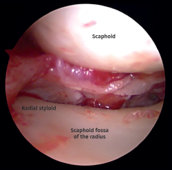 Arthroscopic view through dorsal radiocarpal portal 3/4 in the right wrist of a patient following acute traumatic dorsal pure radiocarpal dislocation (Dumontier type 1), previously subjected to closed reduction. Note the complete lesion due to proximal avulsion of the extrinsic volar radiocarpal ligaments: radioscaphocapitate ligament and the short and long radiolunate ligaments.