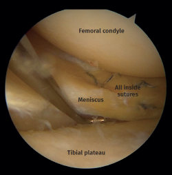 Of the 15 lateral meniscus injuries, there were 9 radial tears treated with partial meniscectomy and 6 peripheral tears that were sutured with a combination of an outside-in and an all-inside technique (Figures 7 and 8).