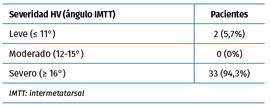 Resultados: se intervinieron 43 pacientes de los que 35 fueron incluidos en el estudio. La media de puntuación AOFAS fue 91,12 puntos en los 12 meses de seguimiento. Las evaluaciones radiográficas postoperatorias mostraron una mejoría estadísticamente significativa en comparación con los valores preoperatorios. La corrección angular media fue 11,3° para el ángulo intermetatarsal y de 21,6° en el PASA. No obtuvimos ninguna complicación.