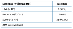 Material y métodos: estudio retrospectivo de pacientes operados de HV con sistema Endolog® entre 2013 y 2014 con un año mínimo de seguimiento. Se valoraron principalmente el ángulo intermetatarsal y el ángulo articular proximal (PASA), criterios radiográficos y el cuestionario de la Asociación Americana de Ortopedia de Pie y Tobillo (AOFAS) como criterio clínico.