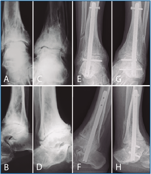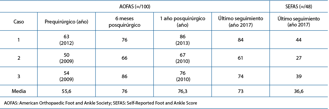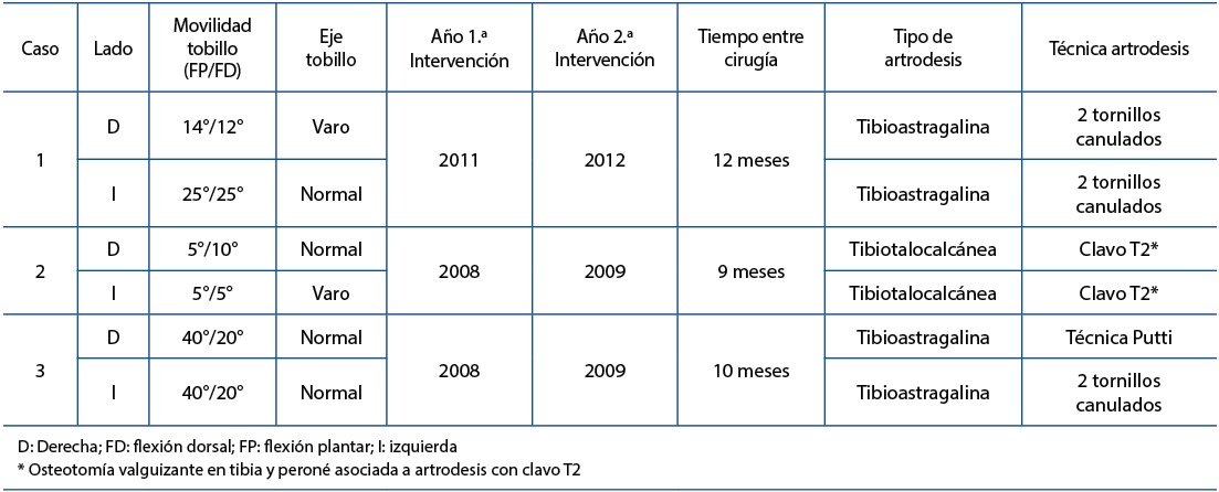 Abstención, artrodesis, artroplastia o combinaciones de estas últimas son las opciones terapéuticas en artrosis bilateral de tobillo. En la indicación quirúrgica es razonable dudar por temor a una mala calidad de vida en caso de artrodesis bilateral. Los pocos estudios publicados se centran en artrodesis de un tobillo. El objetivo de este trabajo es conocer qué resultado funcional pueden esperar los pacientes tratados con artrodesis bilateral de tobillo. Se analizó una serie de casos de 3 pacientes intervenidos de artrodesis bilateral de tobillo en nuestro centro. Se evaluó el resultado funcional preoperatorio y postoperatorio según la escala AOFAS (American Orthopaedic Foot and Ankle Society) para retropié/tobillo y según la escala SEFAS (Self-Reported Foot and Ankle Score) para retropié/tobillo postoperatoria. El resultado funcional fue satisfactorio tras 7 años de seguimiento medio (rango: 5-8) con una puntuación prequirúrgica media de 55,6 frente a 73 puntos en la última revisión, según la escala AOFAS. El resultado funcional según la escala SEFAS fue de 36,6 sobre 48 puntos. En conclusión, en nuestra experiencia y según la bibliografía existente, la artrodesis bilateral de tobillo es una opción terapéutica que puede tenerse en cuenta para el tratamiento de la artrosis de tobillo con un buen resultado funcional.