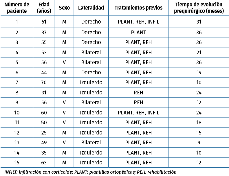 Resultados: el 60% de los pacientes estaban satisfechos o muy satisfechos con el resultado. Once pacientes (73,33%) recomendarían la intervención o se intervendrían el miembro contralateral. Los resultados de la escala EVA pasaron de 8,6 preoperatoriamente a 3,1, lo cual resultó una mejoría estadísticamente significativa. Ninguno de los pacientes presentó complicaciones mayores y solo hubo 2 casos que presentaron un hematoma superficial que se resolvió sin necesidad de reintervenciones o actuaciones adicionales al protocolo postoperatorio habitual. Todos los pacientes menos uno pudieron retornar a su actividad laboral y deportiva previa.