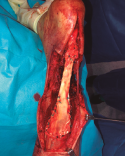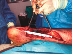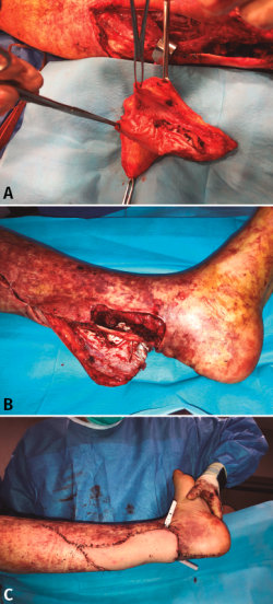 Actualmente hay descrito un amplio abanico de técnicas quirúrgicas para tratar lesiones crónicas del tendón calcáneo en las que existe un defecto del tendón, desde técnicas de avance de la fascia hasta transferencias de tendones o el uso de injertos. No hemos encontrado referencias en la literatura del uso de aloinjerto de tendón calcáneo para lesiones agudas. Nuestro objetivo es presentar el caso clínico de un varón con fractura abierta de peroné de grado IIIB de Gustilo y Anderson con un defecto del tendón calcáneo de unos 15 cm y gran defecto cutáneo, tras sufrir una herida por arma de fuego. Se realizó una plastia tendinosa con aloinjerto de tendón calcáneo y cobertura cutánea de forma simultánea. Tras 10 meses desde la intervención, los resultados clínicos y funcionales son alentadores.