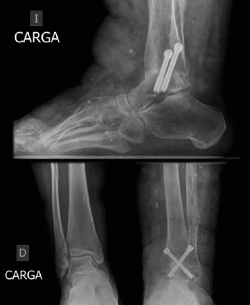 El procedimiento se realizó con el paciente en la posición prona y el uso de 2 portales posteriores. Las superficies articulares se desbridaron retirando el cartílago por medios artroscópicos y la articulación se fijó con 2 tornillos cruzados. La fusión se logró completamente a los 6 meses de seguimiento. A los 2 años de seguimiento, el paciente es capaz de mantener la bipedestación prolongada y caminar largas distancias sin dolor.