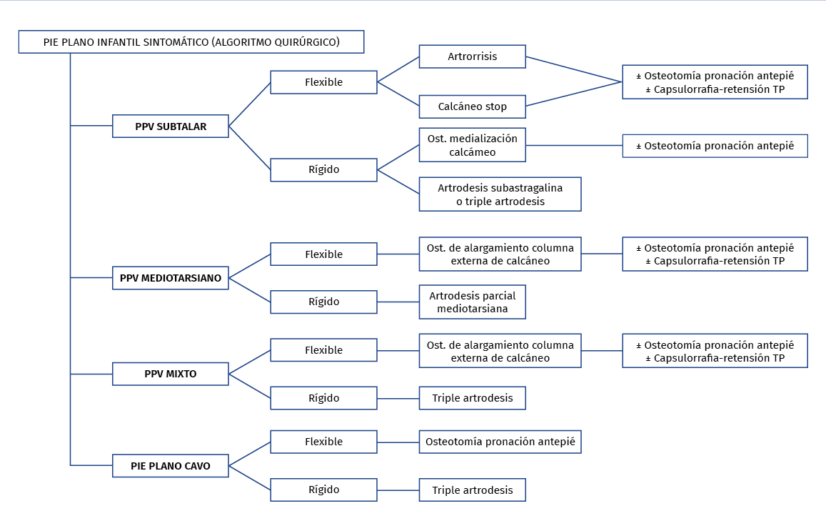 Flat foot is the most frequent pathology in the pediatric orthopedic clinic. From its most banal flexible form to the structured and rigid one, there is a range of therapeutic possibilities. In this update, we aim to update the diagnosis and treatment of its different forms, establishing treatment algorithms in order to help in the decision-making process.