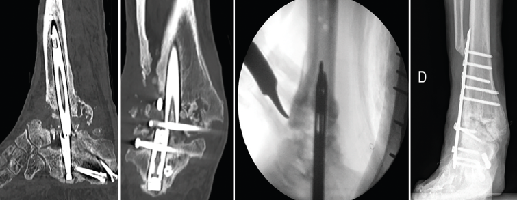 Discussion: to increase the stability after removing the nail, we could use a larger and thicker nail or preferably a locking tibiotalocalcaneal plate.