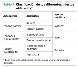 Existen numerosos trabajos sobre diferentes injertos para la reconstrucción del ligamento cruzado anterior. Sin embargo, no hay un acuerdo sobre cuál es el injerto ideal. En el presente artículo revisaremos lo publicado sobre las ventajas y desventajas de cada tipo de injerto, así como sus resultados comparativos. Después de nuestra revisión, no hemos encontrado un consenso sobre qué injerto elegir. Se debe decidir basado en las características del paciente, sus expectativas de recuperación y la vuelta a la actividad deportiva. La mayor controversia existe en pacientes jóvenes y alto nivel de actividad deportiva.