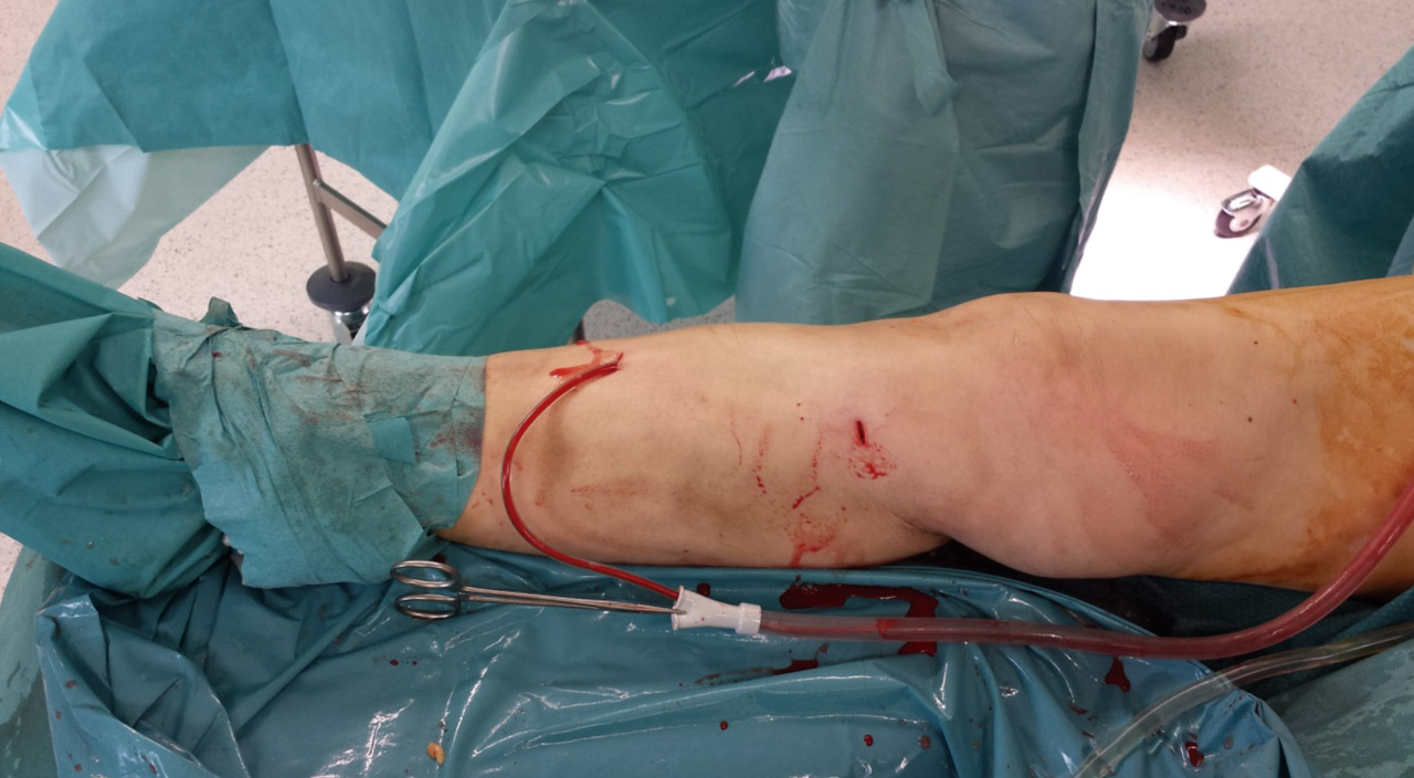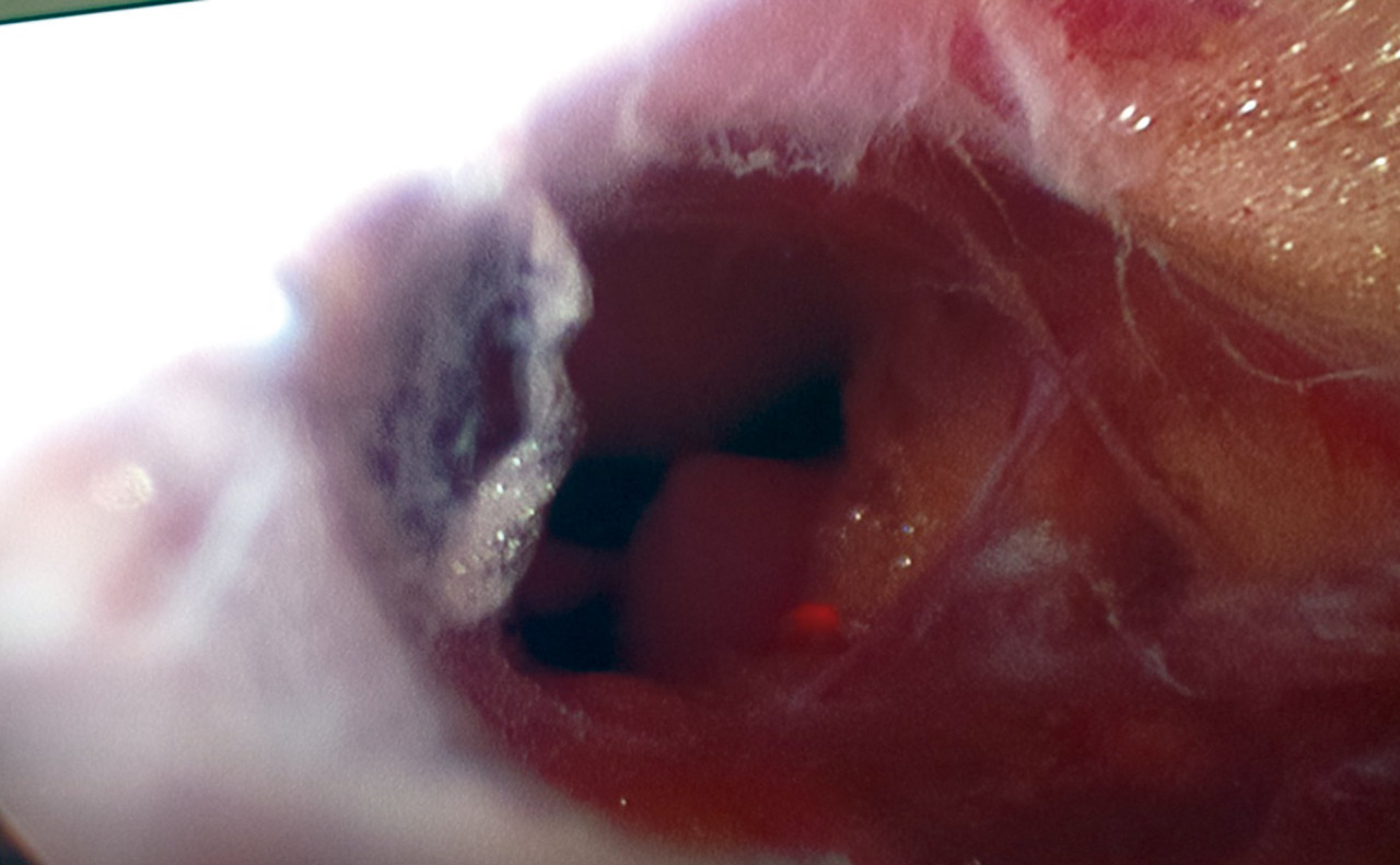 En ambos casos, tras el fracaso del tratamiento conservador mediante reposo y vendajes compresivos, se realizó una evacuación percutánea por punción guiada con ecografía, con reaparición de la clínica tras 1 mes de evolución. Ante esta situación, se decidió tratamiento quirúrgico bajo anestesia raquídea, a la visualización directa de las lesiones mediante endoscopia (óptica de 70° de cadera) (Figura 2), comprobando el contenido líquido seroso de esta, así como la presencia de septos y neocápsula, tomando muestras para estudio anatomopatológico). Mediante la utilización de un sinoviotomo, se procedió al curetaje de los septos y la neocápsula hasta conseguir un lecho sangrante (Figura 3). Por último, se irrigó la cavidad con 500 mg de doxiciclina como agente esclerosante diluidos en el último suero de lavado endoscópico. Como tratamiento complementario, se aplicó un vendaje compresivo y se mantuvo un drenaje de tipo redón durante su ingreso hospitalario (Figura 4).