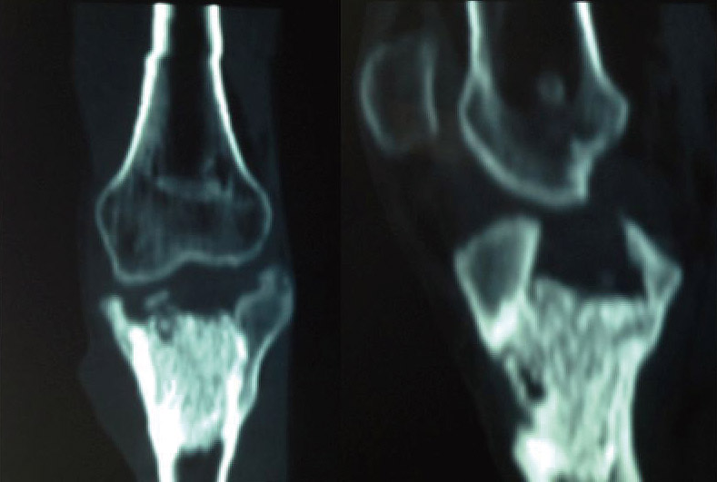 La evolución fue favorable, mejorando la clínica y los parámetros analíticos, resolviéndose la infección y consiguiendo una extensión de –5° y flexión de 95°, aunque persiste un defecto óseo epifisometafisario proximal en tibia izquierda, como se observa tanto en la radiografía como en la TC que se le realizaron tras un año de evolución, donde además se aprecia una artrosis femorotibial incipiente (Figuras 2 y 3).