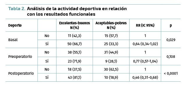Resultados: De los 91 pacientes incluidos en el estudio (101 caderas), 75 practicaban deporte antes del diagnóstico de CFA, ninguno de ellos de forma profesional. De estos, 32 practicaban deporte de forma habitual después del diagnóstico. La carrera continua y los deportes sin impacto como la natación y la bicicleta mostraron una asociación estadística con resultados postoperatorios excelentes y buenos. Los deportes de impacto practicados durante el periodo preoperatorio mostraron una asociación con resultados aceptables y pobres después de la cirugía.