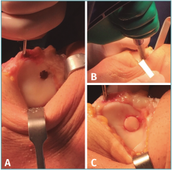 The osteochondral autologous transplantation technique involves the transplantation of small and simple, or multiple cylindrical osteochondral grafts (mosaicoplasty) most commonly harvested from the articular surface that does not support the femoral condyle weight to a receptor area that contains the chondral defect. The advantages of the procedure include reconstruction with hyaline cartilage in a single-stage operation, either through arthroscopy or mini-incision.