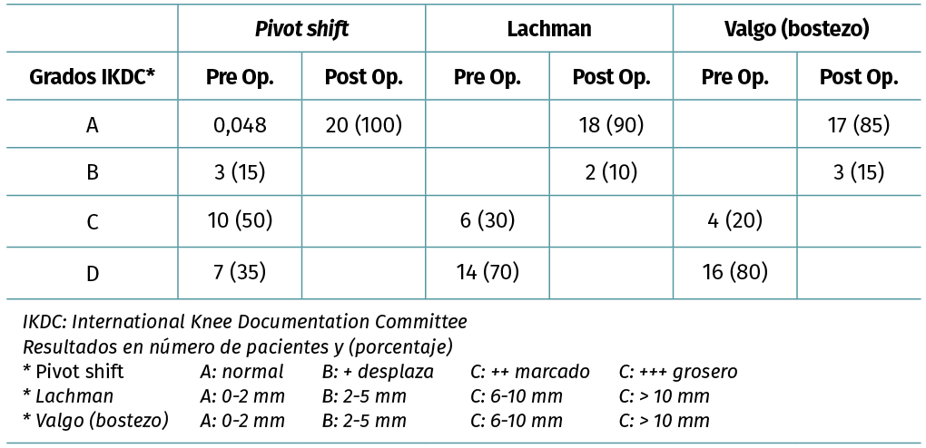 Methods: a total of 20 athletes with acute simultaneous ACL/grade III MCL reconstructions were treated between March 2006 and January 2014. The minimum follow-up time was 24 months. Subjective functional results (International Knee Documentation Committee –IKDC–, Lysholm), range of motion, anterior-medial and rotational stability (Lachmann, pivot shift, valgus stress) were evaluated. The ability to return to sport (Tegner) and the level achieved was recorded.