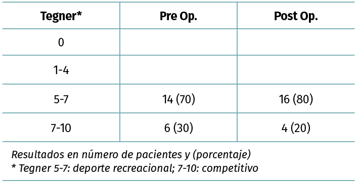 Material y métodos: un total de 20 atletas con reconstrucciones agudas simultáneas de LCA y LCM de grado III fueron tratados entre marzo de 2006 y enero de 2014. El tiempo mínimo de seguimiento fue de 24 meses. Se evaluaron los resultados funcionales subjetivos (International Knee Documentation Committee –IKDC–, Lysholm), rango de movilidad, estabilidad anteromedial y rotacional (Lachmann, pivot shift, estrés valgo). Se registró la capacidad de retorno al deporte (Tegner) y el nivel alcanzado.
