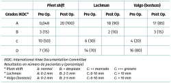 Conclusión: los pacientes con reconstrucción simultánea de LCA y LCM presentan a una mejoría significativa en los scores funcionales y las maniobras de inestabilidad de rodilla, logrando retomar su nivel deportivo previo en la mayoría de los casos.
