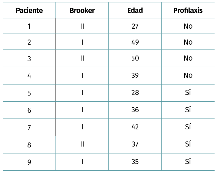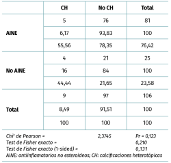Resultados: durante este periodo, 106 casos cumplen criterios de inclusión. La tasa de CH en nuestros pacientes ha sido globalmente de un 8%. Si estratificamos los resultados según profilaxis o no con antiinflamatorios no esteroideos (AINE) de forma postoperatoria obtuvimos una tasa de calcificaciones del 6% en el grupo AINE frente a una tasa del 14% en el grupo no AINE. En el análisis estadístico las diferencias observadas no han sido estadísticamente significativas (p = 0,123). Todas las calcificaciones fueron Brooker I o II.