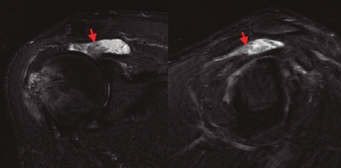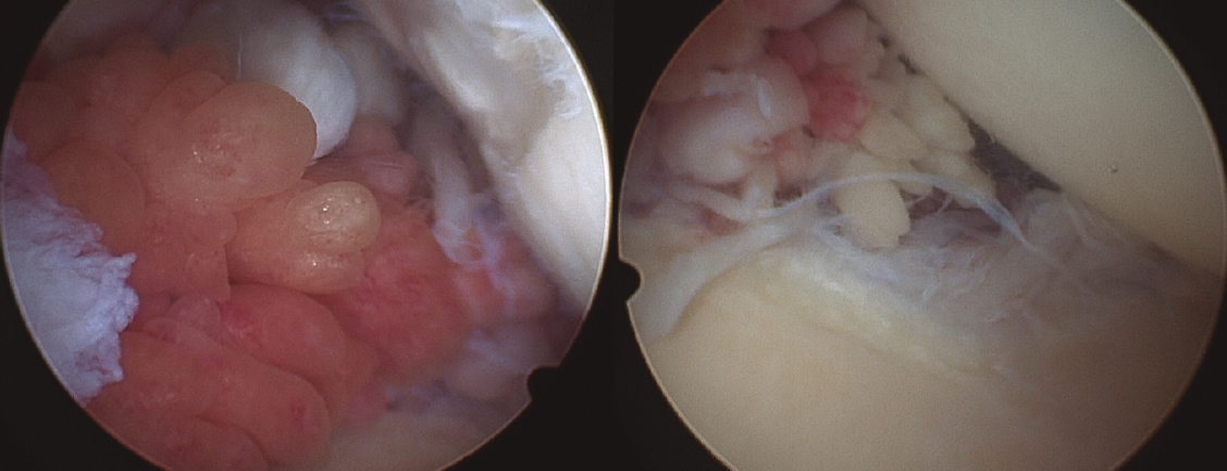 Se trataron 5 casos, 3 casos en hombro y 2 casos en rodilla (si bien en otras series de casos son más frecuentes en rodilla). La edad media de los pacientes fue de 54 años, siendo 3 varones y 2 mujeres. El IMC medio fue de 26,5 y el tiempo medio desde el inicio de los síntomas hasta el tratamiento quirúrgico fue de 17,4 meses. El tratamiento de elección en el LA sintomático fue el desbridamiento y electrocauterización, bien de manera abierta o artroscópica. Se trataron en un mismo tiempo las lesiones asociadas (lesiones del manguito rotador y porción larga del bíceps). En todos los casos se tomaron muestras para anatomía patológica, que confirmó los diagnósticos al observar vellosidades de tejido adiposo maduro con cambios de sinovitis. Ningún paciente ha requerido cirugías adicionales, habiendo tenido todos una resolución satisfactoria de la clínica.