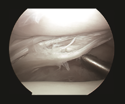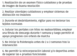 La patología de partes blandas representa entre el 30 y el 50% del total de las lesiones dolorosas que se diagnostican en el tobillo y las articulaciones subastragalinas. Con el desarrollo de la artroscopia de tobillo, actualmente es posible el diagnóstico y el tratamiento de esta patología. Se describen los síndromes patológicos más frecuentes y su sustrato anatómico. También se describe de forma pormenorizada la técnica quirúrgica mediante artroscopia, la pauta postoperatoria y se incluye un apartado de consejos y trucos útiles para hacer más eficiente la técnica y evitar complicaciones.
