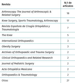 Results: there is a statistically no significant difference between the publication rate of each congress (AEA = 10.36%; SEROD = 11.45%; SEROD + AEA = 12.09%; p > 0.05). There is also a non-statistically significant difference between the value of the population studied (n) and the publication ratio (mean n of YES = 156.5379; mean n of NO = 108.99; p = 0.150). Report the value of the study population with respect to NO, it presents statistically significant different publication ratios (YES informs AND Yes published: 12.62%; NO report and YES publish: 1.15%; p = 0.0027). The percentage of provinces of origin of oral communications shows that in all cases the presence of Barcelona + Madrid is between 53.11 and 55.22%. The presence of Barcelona + Madrid in those communications that manage to publish is 80.09%. Knee communications have a higher percentage of publications. The most frequent publication journals are Arthroscopy and Knee Surgery, Sports Traumatology, Arthroscopy.