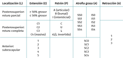Se han descrito muchas clasificaciones del manguito rotador; sin embargo, no existe ninguna que englobe todos los criterios que permitan un diagnóstico y un tratamiento óptimos. Estas clasificaciones deben describir la localización y la forma de la rotura, y tienen que ser reproducibles y validadas por médicos e investigadores.