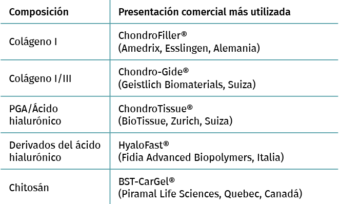 Implants composed of semisynthetic derivatives of hyaluronic acid can also be found, structured into randomly distributed fibers, with no particular predominant direction. This facilitates cell contact and extracellular matrix formation, as well as MSC retention. Buda(41) described their use in 2010, combining the AMIC technique with bone marrow MSCs obtained from the centrifugation of iliac crest marrow aspirate and platelet rich plasma (PRP). These membranes are impregnated with the MSC concentrate and are placed in the defect, followed by the application of PRP supplying growth factors. Vannini(42) reproduced the technique in 6 patients with osteochondritis dissecans, with good results.