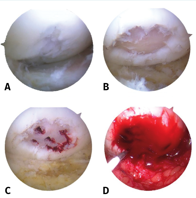 Figure 2. View of the right knee from the anteroexternal port. Chondral lesion in the internal femoral condyle measuring 10 × 20 mm. A: Outerbridge grade III chondral lesion; B: lesion cleared to the subchondral bone and performance of microfractures; C: placement of the type I/III collagen matrix; D: final view with complete covering of the chondral defect.