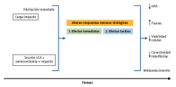 The reduction of fibril interconnectivity is the first sign observed after these forces, which weaken the tissue before the changes in cell viability and GAG losses in the superficial cartilage layers become apparent(104,110,111). The progressive increase in mechanical demands leads to cell death, collagen denaturalization and -eventually- the induction of surface fissures(112) (Figure 4).