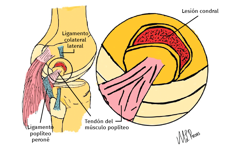 We present the unusual case of a woman with osteochondral fracture of the external femoral condyle affecting the insertion of the TP, and causing episodes of joint subluxation with pain and instability sensation upon walking. Surgical treatment was decided in view of the ineffectiveness of initial conservative treatment and persistence of the instability symptoms.