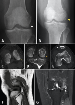 A 30-year-old woman reported to the emergency room due to pain and functional impairment following indirect low-energy trauma of the left knee. The physical examination revealed signs of local inflammation, pain in response to palpation of the lateral joint line, and painful functional limitation in both active and passive mobilization that made walking impossible.