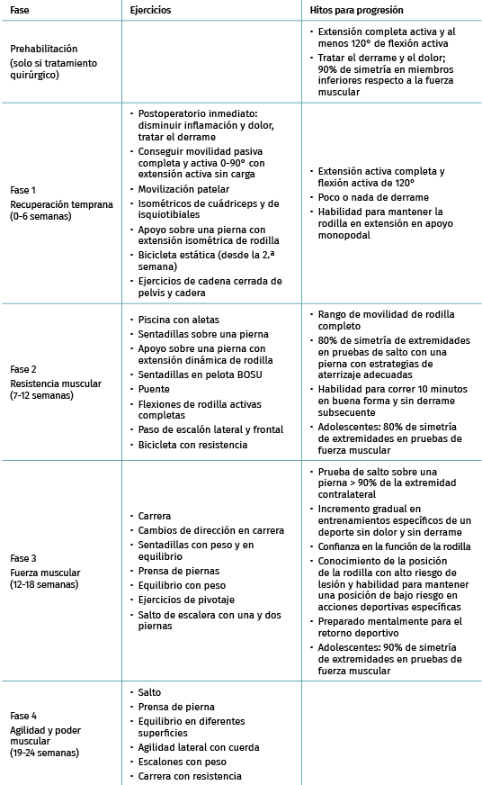 In order to move from one phase to another we must reach the objectives established in each phase. The objective in the first phase is to achieve rapid functional recovery and important muscle activation. In phases 2 and 3, the objective is to ensure adequate alignment of the extremities, together with correct support and loading techniques. Finally, in phase 4, secondary prevention measures to avoid new injuries are established, and we seek to reach neuromuscular functional stability before the return to sports activity.