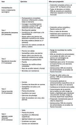 Four postoperative rehabilitation phases(111) and a prehabilitation phase(112) have been established in the case of surgical treatment for ACL rupture (Table 2). In the two cases (i.e., operated upon or not), the reference of progression through the objectives is similar in both groups. However, there are different expectations in terms of progression and in the time to fully return to sports activities. In all cases we must be guided by clinical and functional objectives, and the return to sports activities will be conditioned to reaching these objectives(113).