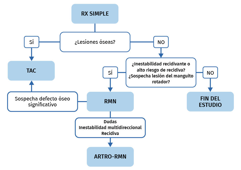 The study protocol will differ in the case of symptomatic recurrent instability, where the aim will be to identify the underlying cause, precisely establish the type of lesions to allow correct surgical planning where indicated, and rule out associated lesions. We must start the study with good radiological projections in the form of an AP view and an axillary view, and with an MRI scan. This will allow us to diagnose damage to the labrum, capsule-ligament structures and chondral, bone and tendon elements.