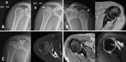 Anteroposterior (AP) projections in the scapular and axillary plane are basic for assessing adequate joint congruence, the joint space and the presence of possible bone lesions of the humeral head (Hill-Sachs or McLaughlin lesions) and glenoid cavity. It is advisable to add AP projections with rotations and scapular projection in Y to better visualize the tuberosities, coracoid process, acromion and bone defects(19).