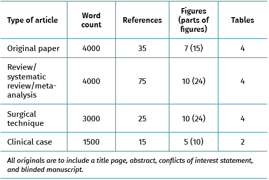 Manuscript preparation in reference to "Surgical techniques" should follow the same editorial norms as those mentioned above for original papers, reviews, systematic reviews and meta-analyses, with the following particularities: