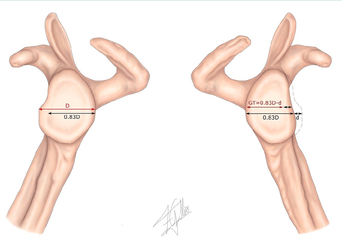 Figure 1. Evaluation of instability with bone defect. Schematic representation of measurement of the real diameter of the contralateral glenoid cavity (D) and of the glenoid bone defect (d) for calculating glenoid track (GT) based on the following formula: 0.83 × (D − d).
