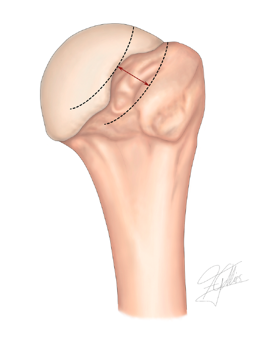 Hill-Sachs deformity is best measured in axial views at the uppermost surface of the proximal humerus, above the coracoid process(47). The widest region of the Hill-Sachs deformity is the most important measurement with respect to the glenoid track, and the depth of the deformity can be studied by tracing a circle through the upper surface of the proximal humerus(41).
