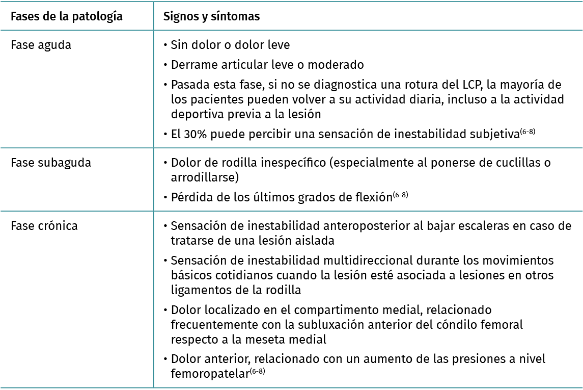 Isolated PCL injuries may go unnoticed for a number of reasons, in contrast to injuries of the ACL. Table 1(6,7,8) describes the signs and symptoms in the different stages of PCL injury.