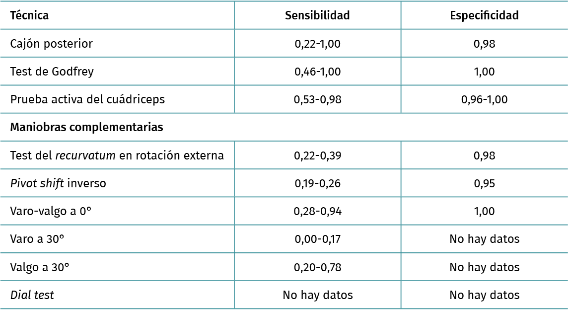 Some exploratory manoeuvres are specific of PCL injury, while others indicate associated lesions. Their sensitivity and specificity are reported in Table 2. Bilateral manoeuvring is recommended in all cases, involving both knees, in order to distinguish between physiological hyperlaxity and pathological instability.