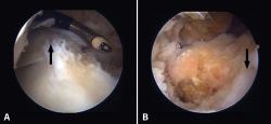 The anatomical references for arthroscopically recognizing the tibial insertion site of the PCL are the most posterior and lateral fibers of the posterior horn of the medial meniscus (Figure 10), defined as shining white fibers that delimit the insertion site medially, and the fibers of the popliteus muscle that indicate the distal margin (27).