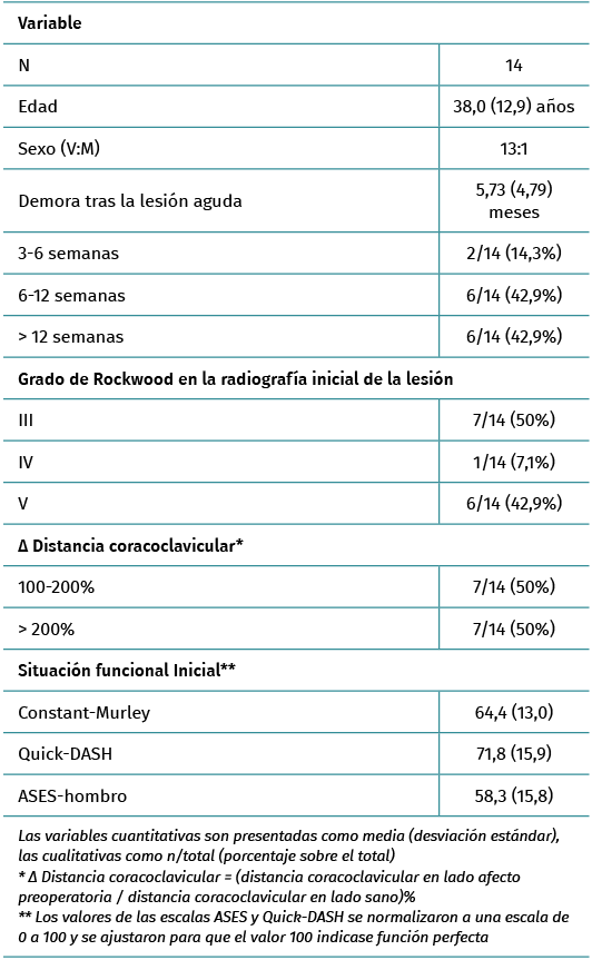 The MADOK technique was applied to a total of 19 patients between January 2015 and January 2020. Two subjects were excluded: one presented malunion of an associated fracture of the middle third of the clavicle, and corrective osteotomy was performed at the same time, while the other patient had undergone surgery for acromioclavicular instability on three previous occasions. Thus, the inclusion criteria were finally met by 17 subjects, of which 14 (82%) were available for evaluation an average of 2.7 (1.1) years after surgery (range 14 months - 5 years).