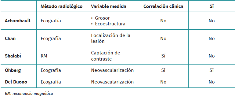Although studies have been made of the prognostic usefulness of many radiological variables in Achilles tendinopathy, there is no agreement as to which of them are important enough to serve as the basis for a universal classification system(4). For this reason, different classification models have been proposed depending on the ra diological variable analysed — though none of them can be taken to constitute a clear reference standard. Table 1 provides a summarised comparison of the classifications which are described below.