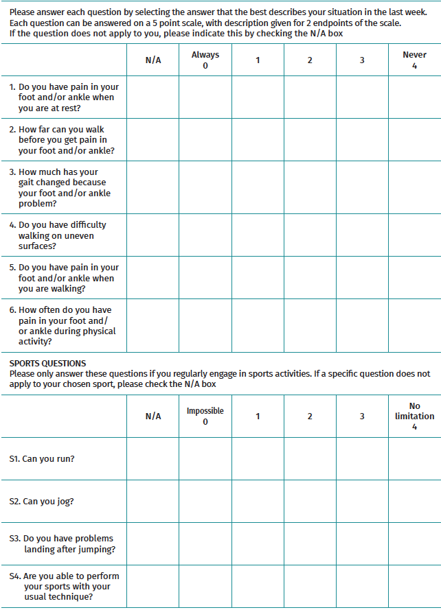 The FAOS is a questionnaire entirely self-completed by the patient. It comprises 42 items that evaluate the outcomes based on 5 subscales (pain, other symptoms, activities of daily living, sports and leisure activities, and quality of life related to the foot and ankle). It appears to be useful for evaluating outcomes that are relevant for the patient and addresses ankle stability following ligament reconstruction.