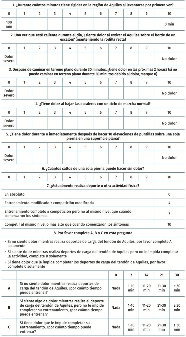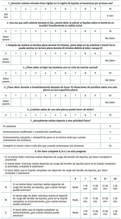 It is easily understood by patients and has been shown to offer good clinical correlation(30). In addition, the VISA-A has been validated in Spanish(31). In sum, it is considered to be the reference scale for assessing the severity of Achilles tendinopathies.
