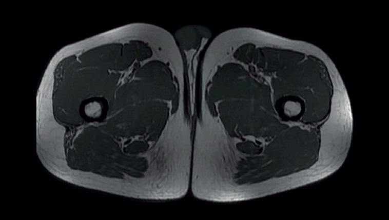 Figure 3. Axial (T1) view of the thighs, showing the typical "comma" image of the rectus femoris of both quadriceps.