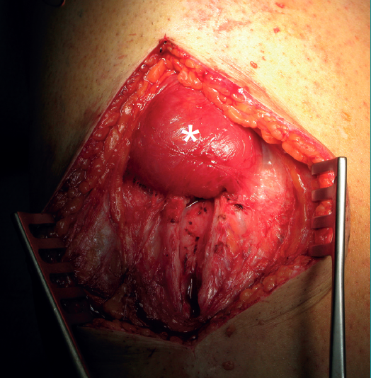 Figure 1. Right thigh. The head is to the left of the image. Complete sectioning of the vastus medialis, rectus femoris and vastus intermedius caused by the fall of a blunt and very heavy object (the edge of a metal door, from a height), with the knee flexed. Surgical approach for suturing the different muscle bellies.