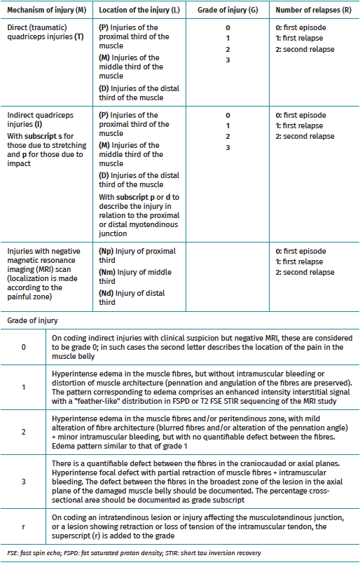Other classifications, such as that of the British Athletics Association(18), include consideration of both the anatomical location (myofascial, musculotendinous and intratendinous) and the extent of the lesion in the MRI scan - taking into account not only its longitudinal extent but also its cross-sectional area. However, these classifications do not contemplate either the mechanism producing the injury or whether the injury is of a primary or recurrent nature. Consequently, a new classification has recently been proposed that includes all these parameters and which may be applied to the quadriceps in view of its characteristics, despite the fact that the classification was initially validated for knee flexor muscle injuries(19). This classification (Table 1) includes four main categories that are related to factors that can be of clinical and prognostic importance: the mechanism of the injury (M), the location of the lesion (L), the severity grade (G), and the number of relapses (R). In turn, within category M, we can find direct and indirect injuries and subtypes (S) for lesions caused by stretching and for those produced by speed actions (P). In relation to the location of the injury, three regions are contemplated: proximal, central and distal zone of the muscle belly. In addition, the relation of the injury to the musculotendinous junction zone is taken into account (including the central tendon). Grading of the lesion is based on the MRI images obtained in T2-weighted sequences, where the presence of edema is rated as positive and scored from 1-3 according to its size, while the absence of edema is rated as negative. In addition, if the MRI study evidences an intratendinous lesion, injury affecting the musculotendinous junction, or a lesion showing retraction or loss of tension of the tendon, the classification adds (r) as a superscript. Recurrences (R) correspond to lesions of the same type and which appear in the same location as the initial lesion, during the first two months after returning to competition.