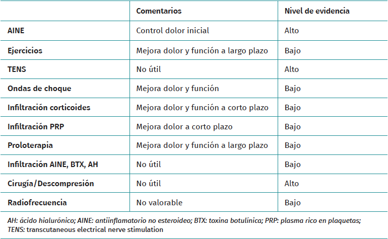 In relation to infiltrations with NSAIDs, the existing data do not show them to be superior to the use of corticosteroids(66,67). With regard to BTX, its use has been advocated in shoulder pain in hemiplegic patients(68). Hyaluronic acid has not been found to be of benefit in patients without osteoarthritis(55).
