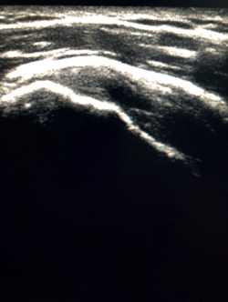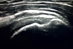 The characteristic ultrasound image of tendinosis consists of local or diffuse thickening accompanied by a hypoechogenic and heterogeneous appearance of the tendon (Figure 3). A fine hypoechoic line over 2 mm in thickness between the tendon of the supraspinatus and the subdeltoid adipose tissue corresponds to subacromial-subdeltoid bursitis, and the presence of fluid in the bursa is related to a high probability of partial or complete injury of the tendon of the supraspinatus muscle(26). In order to achieve greater diagnostic accuracy and distinguish between an inflammatory process and a normal small amount of fluid in the bursa, we should take into account that bursitis, tenosynovitis and tendinitis are characterized by the presence of hyperechoic zones with areas of enhanced flow in the Doppler ultrasound study. Both bursal and articular partial ruptures appear as a hypoechoic discontinuity in the tendon that does not vary on modifying the inclination of the ultrasound probe in either the long axis of the tendon nor its short axis(19). This latter aspect is important in order not to confuse partial lesions with anisotropic phenomena, which are a change in tissue behaviour according to the ultrasound angle of incidence(27) (Figure 4).