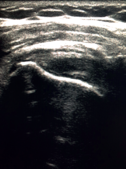 One of the aspects that has changed most in relation to the use of imaging tests is the increased use of ultrasound systems outside the Radiology Department as a complement to physical examination, for example, in the field of sports medicine or traumatology(22). The fact that the results of ultrasound exploration are dependent upon the operator implies that due training is required in order to secure reliable and useful findings. The advantages of ultrasound include its cost, the safety of the procedure, and the fact that it is available in practically any medical centre. In addition, the technique can be performed simply and quickly with comparison against the healthy extremity, exploration can be made on a dynamic basis, and inter-observer correlation is excellent for many shoulder disorders. Furthermore, ultrasound-guided infiltrations are more precise than infiltrations guided by anatomical references(23),and we can perform ultrasound-guided therapeutic procedures such as needling and lavage ("barbotage") in patients with calcific tendinitis(24).