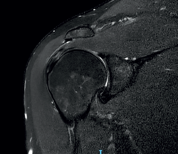 The so-called sentinel cysts(36) are intramuscular cysts formed by a fluid collection that leaks from the joint space through a defect in the rotator cuff, and which are suggestive of damage to the latter through delamination.