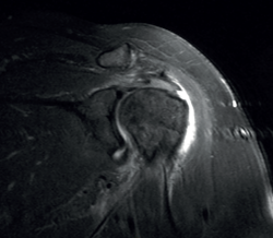 A lesion is classified as being of partial thickness if an abnormal fluid signal intensity in T2 sequencing is seen to extend through a portion of the tendon without affecting its full thickness (Figure 7). These may be bursal or articular lesions, though the latter are more common. There is a possibility that the thickness of the partial lesion may be occupied by scar or granulation tissue, thereby complicating the diagnosis. It has been suggested that the use of arthroMRI in the ABER (abduction + external rotation) position can improve the diagnosis and the typing of these injuries(34). According to Ellman(35), partial thickness lesions can be classified into three grades: grade I (lesion depth < 3 mm), grade II (depth 3-6 mm) and grade III (depth > 6 mm). Taking into account that a healthy supraspinatus measures between 10-12 mm in thickness, grade II lesions affect over 50% of this thickness. Intra-substance lesions are characterized by a fluid-type signal in the thickness of the tendon, without extending to the bursa or joint space.